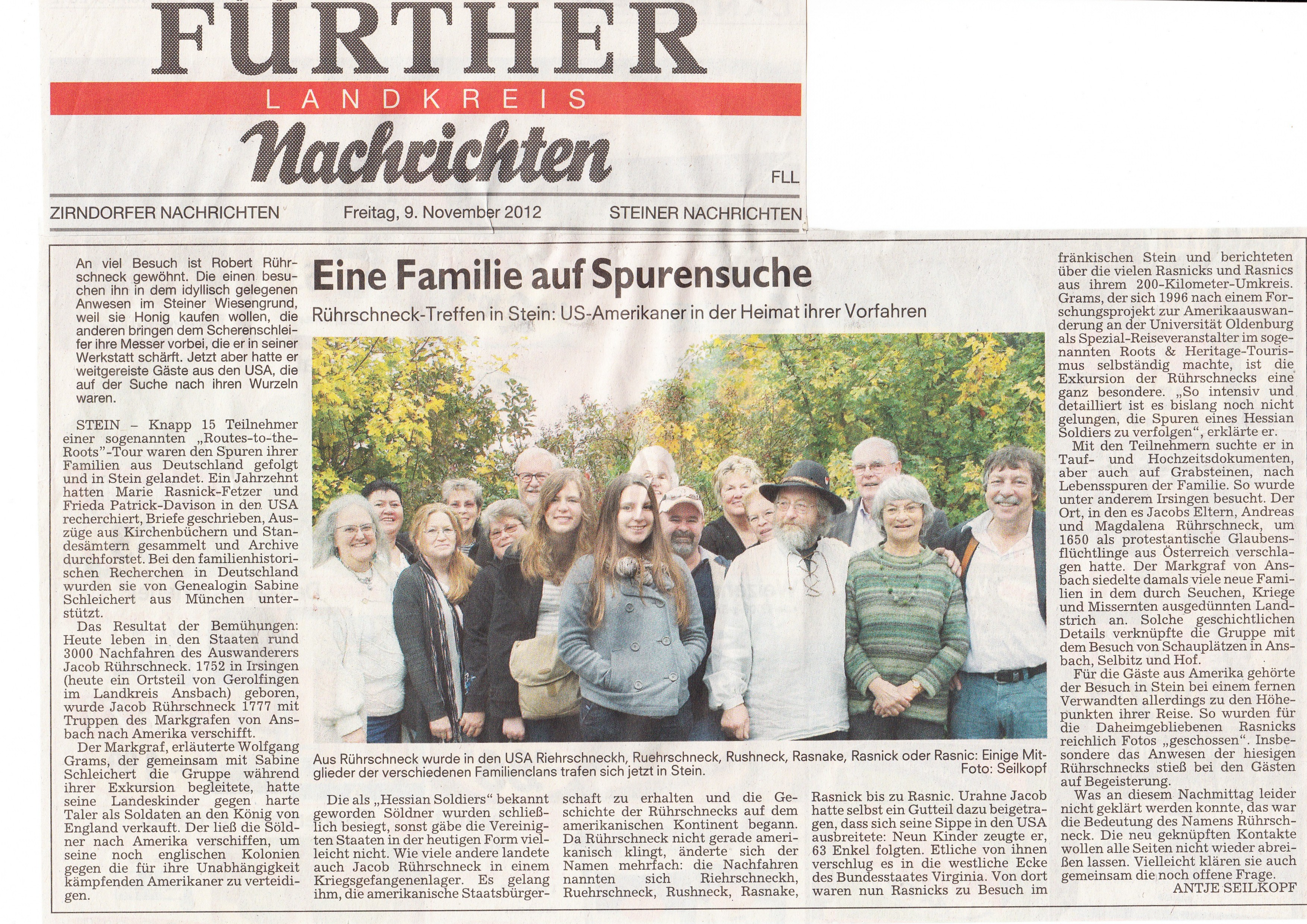 "A Family Looking for Traces" article in Further Landkreis Nachrichten, the Furth District News 9.11.2012